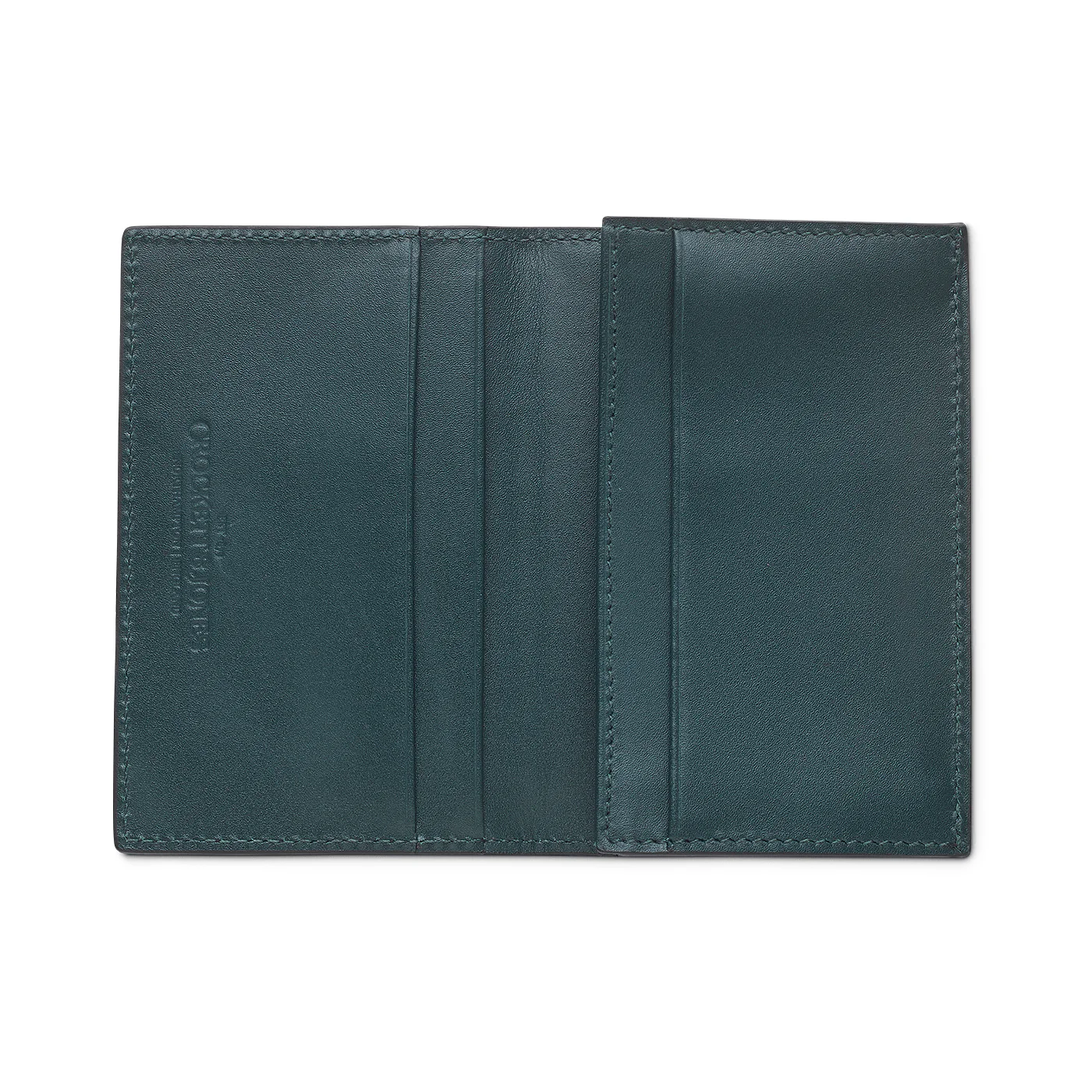 The folded card case is our mid-sized wallet. It features space for three to six cards and an expanding, gusseted pocket for folded notes. Every wallet is fully leather-lined in dark green calf with hand-finished edges. Every stitch is handmade in England.