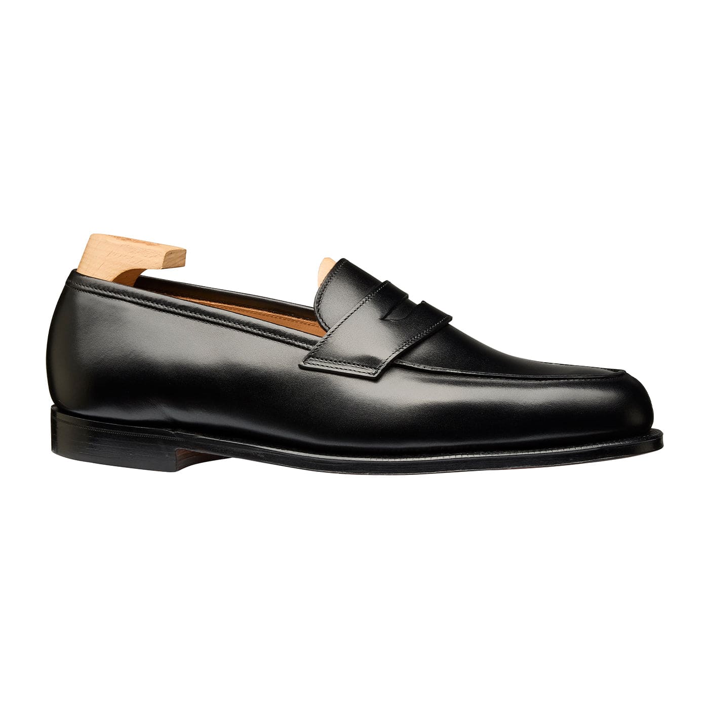 Lincoln, a split-toe penny loafer with a butted seam apron. Made on the well-known 314 last, produced from the finest black calf and featuring our traditional single leather soles.