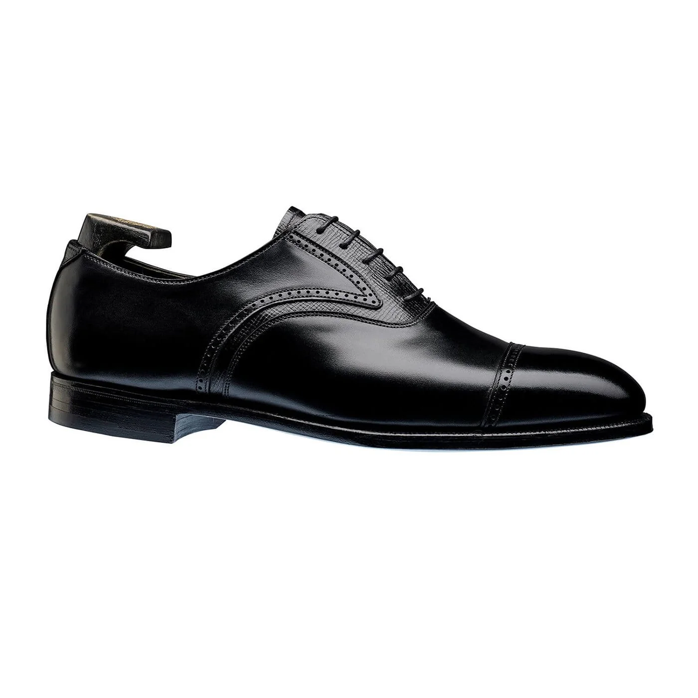 Perry (street), ‘a very distinctive style’ as described in our 1920s special edition catalogue. A pin-punch cap English Oxford with exquisite swan neck facing details. Made from the smallest and tightest black calf skins with a notion of our linear willow grain (also in black) found under laid in the shapely swan neck facing and art deco ‘fishtail’ back strap. Featuring Rendenbach leather soles and historical detailing in abundance. From the 140th Anniversary Collection.